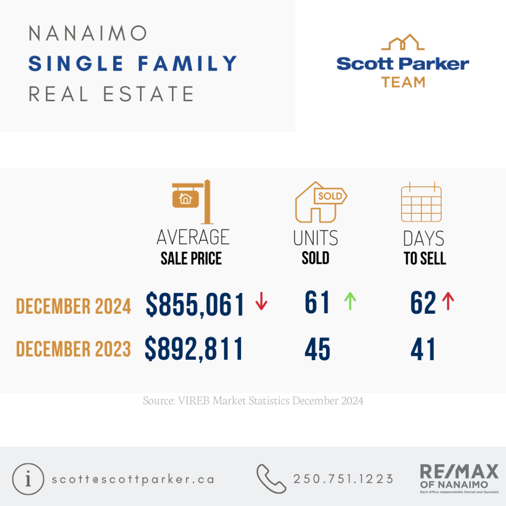 The Vancouver Island Real Estate Board (VIREB) recorded 7,489 unit sales (all property types) in 2024 compared to 7,297 in 2023 and 7,810 in 2022. December 2024 saw unit sales of 443 (all property types) and 2,883 active listings.